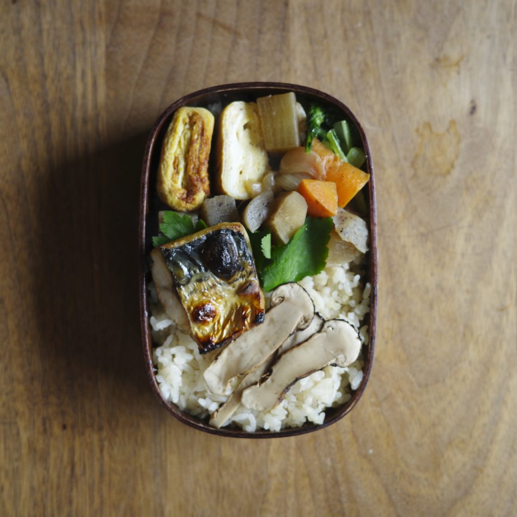 過ぎ行く秋を惜しむように本日のお弁当は松茸。昨晩は松茸ご飯と秋刀魚の塩焼きの夕飯でしたが、その残りのご飯をお弁当に詰めました。