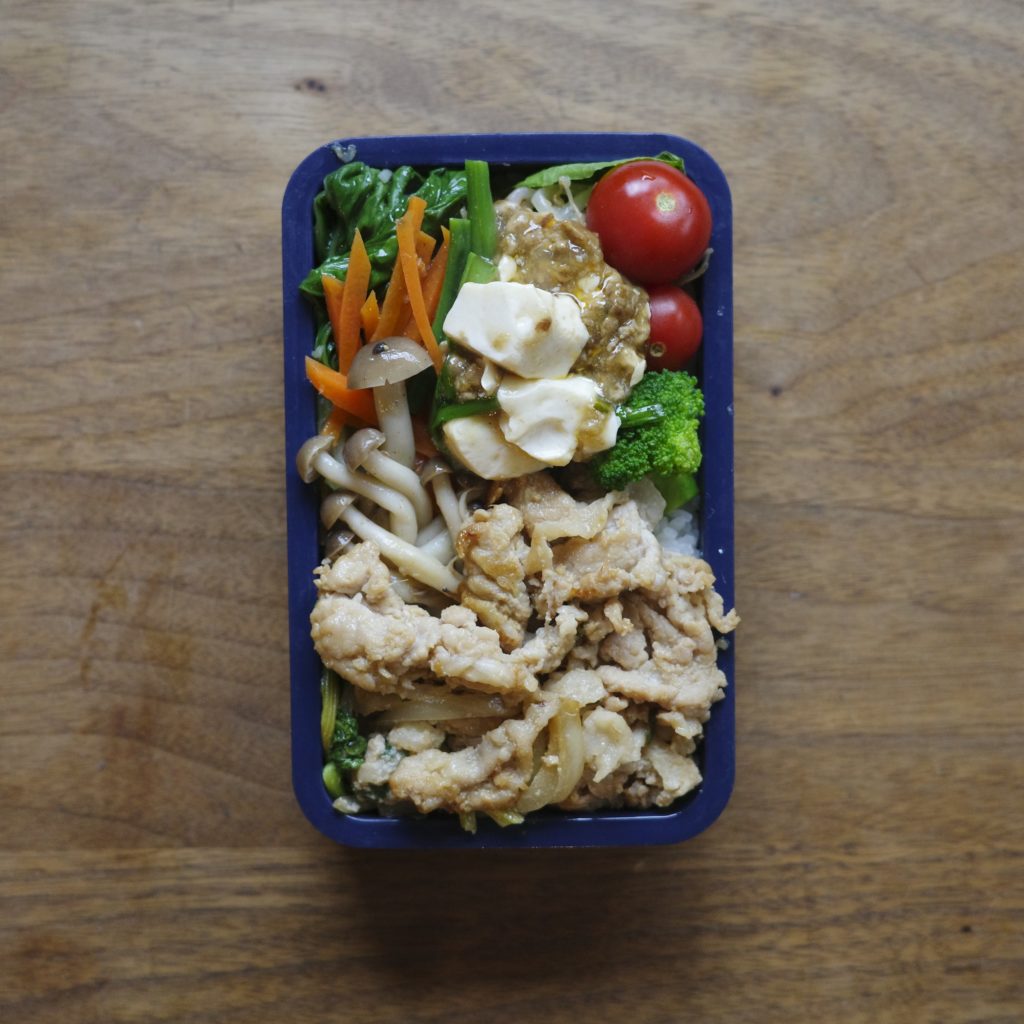 本日のお弁当は始末料理。冷蔵庫の中の食材を処分することを前提に、メニューを考えました。冷凍庫にあった豚バラ肉を解凍。生姜と塩胡椒、みりん、醤油と一緒に一晩マリネしたものを今朝、ごま油で炒めました。